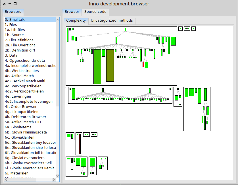 As we learned from Parnas about design [2], the order in which things have actually been done is not the same as the way it should be presented to the different stakeholders. MOOSE provided us with easy to use tooling to build inspectors and browsers, and we created specialized ones. This is the one for developers, now showing a visualization of the complexity of the migration source code.